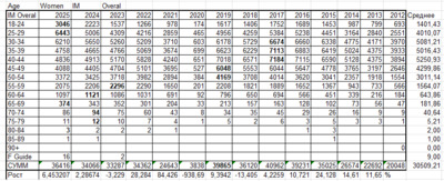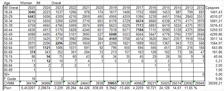 Рост количества участников продолжается. У мужчин он 4,2%, а у женщин 6,4%, что в числовом эквиваленте составляет несколько тысяч новых участников, где большая часть пришла именно в младшие возрастные группы. Тенденция в 2025 году наблюдалась в приросте младших и старших возрастных групп, в то время как количество участников среднего возраста уменьшилось. Рекордным годом был 2019 год для этих возрастных групп у мужчин и 2017 и 2019 у женщин. В возраста 60+ пополняются группы новыми участниками – сразу несколько групп показывают рекордное количество в этом сегменте. Ну а рекордный и массовый прирост младших групп не только бьёт предыдущие рекорды, но и прогнозирует высокую конкуренцию, которая снизит время преодоления двух дистанций Ironman.