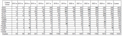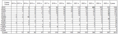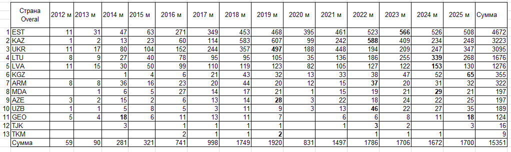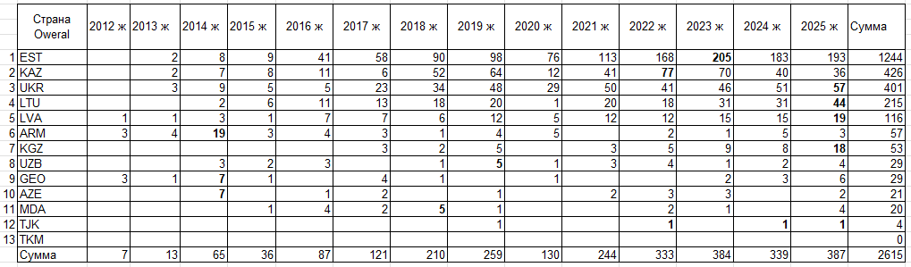 Эстонцы продолжают лидировать по количеству готовых спортсменов (выступивших на гонках Ironman). Прирост участников у Эстонии немногим ниже, чем на пике 2023 года. Украина существенно прибавила в количестве у мужчин и установила рекорд по количеству выступивших женщин, занимая вторую позицию. По мужчинам украинцы практически вышли на показатели 2018 года (рекорд был в 2019), а женщины обновляют прошлогодний рекорд. Второй год подряд третье место занимают представители Литвы. Они обходят экс-призера Казахстан по количеству мужчин и устанавливают новый рекорд по количеству женщин. На прошлогоднем уровне остается Казахстан, занимающий четвертое место по итогам 2025 года. Пятое место сохраняет Латвия с рекордным количеством женщин для страны. А БУМ триатлона наблюдается в Кыргызстане. Страна бьёт рекорд по количеству мужчин и женщин занимая шестую позицию. В топ-10 Узбекистан, Армения, Азербайджан и Молдова. Открывает второй десяток Грузия, с рекордным количеством мужчин, и замыкает Таджикистан. Туркмены на старты в 2025 году не выходили. По сумме мужчин и женщин за все годы с (2012 по 2025) позиции стран в таблице не изменились.