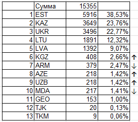 По доле всех готовых спортсменов, выступавших на гонках, лидирует Эстония. Казахстан и Украина в призерах. Четвертое место у Литвы и пятое и Латвии. Кыргызстан обходит Армению занимая 6 и 7 места соответственно. Молдова пропускает вперед Азербайджан и Узбекистан замыкая десятку. Открывают второй десяток Грузия, Таджикистан и Туркменистан.